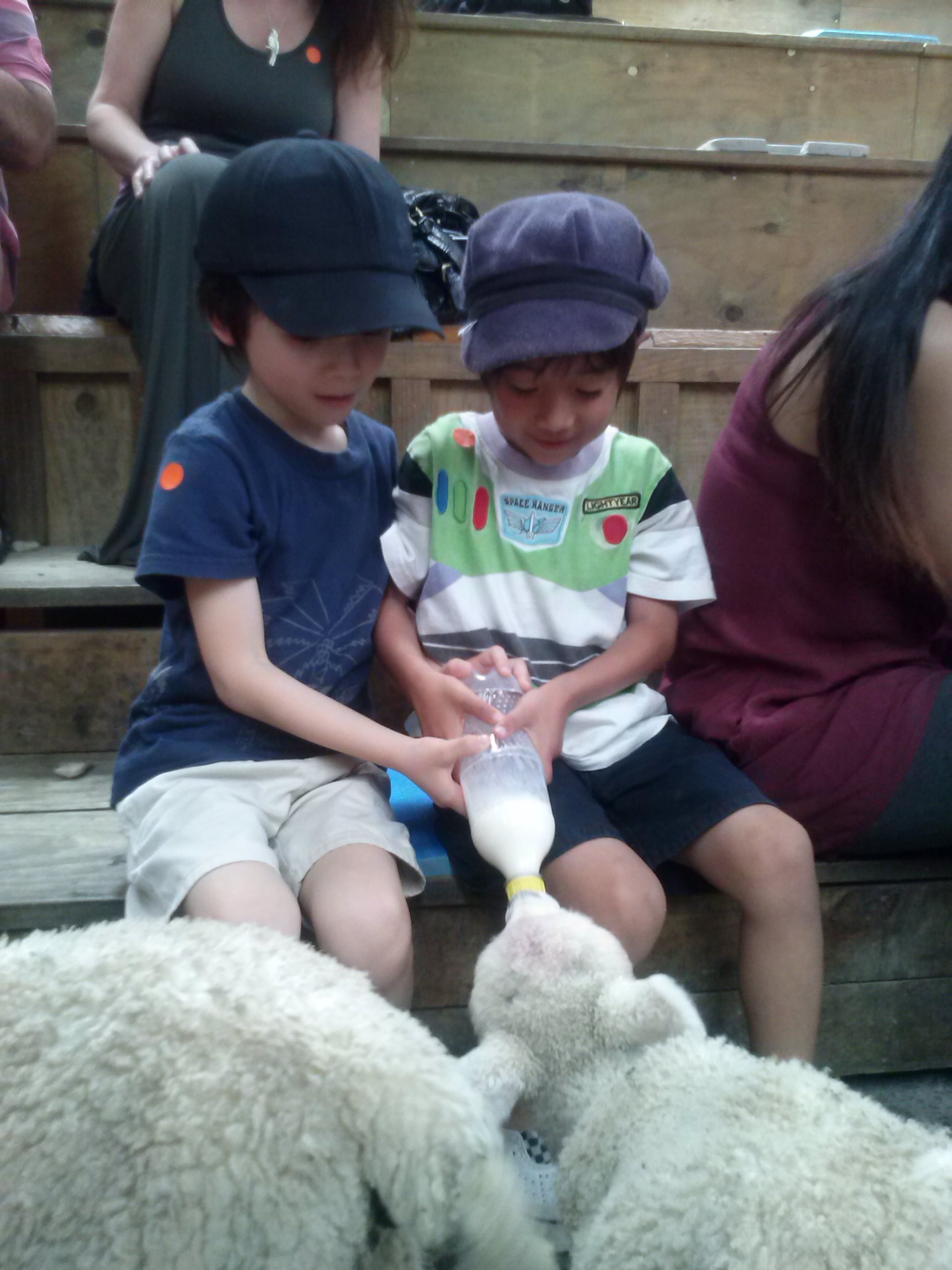 羊の毛刈りショーの後は、子羊メリーちゃんにミルクやり