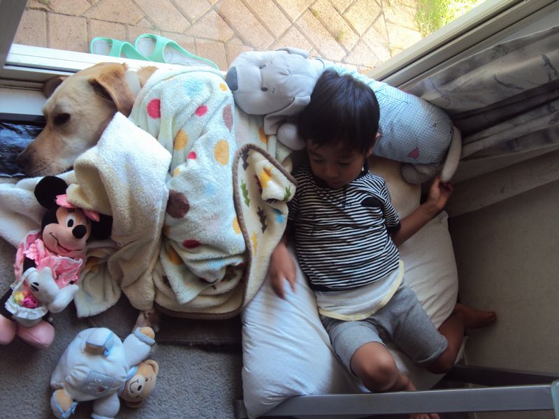 おとなしく毛布かけられて、乗っかられております。