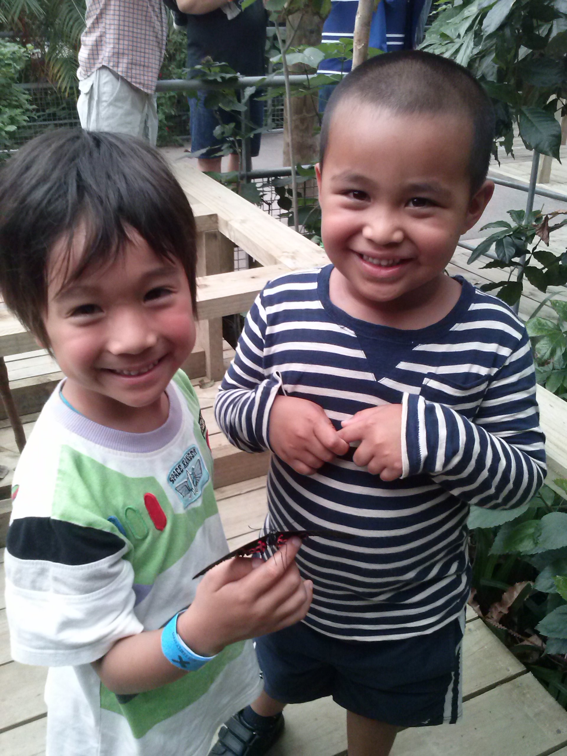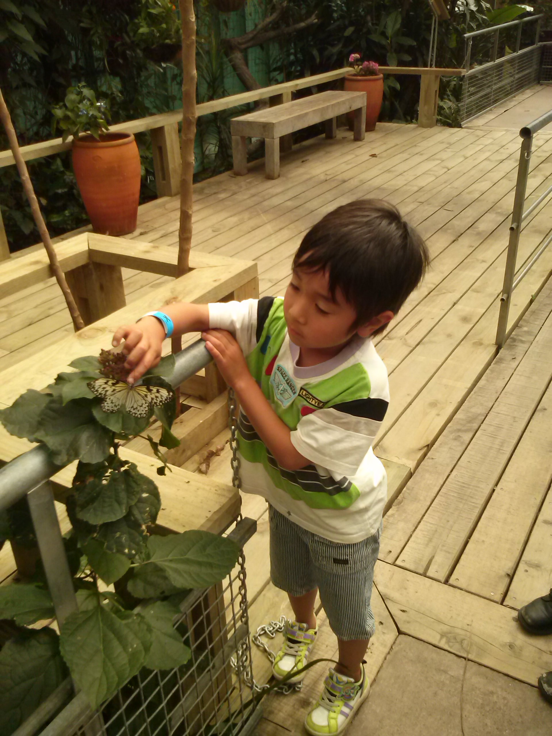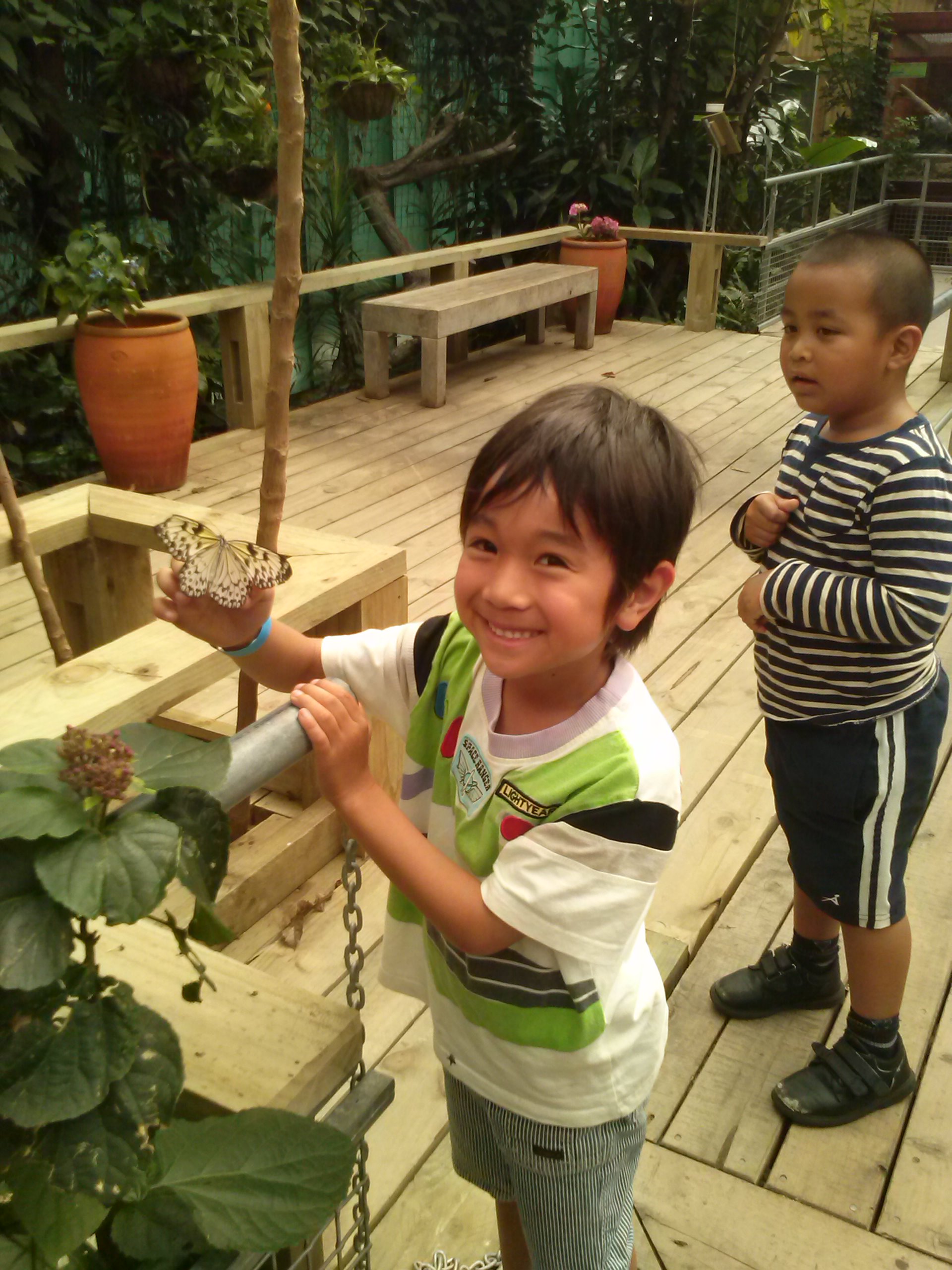 ここの温室の蝶はなぜか人懐こく、手にとまってくれます。