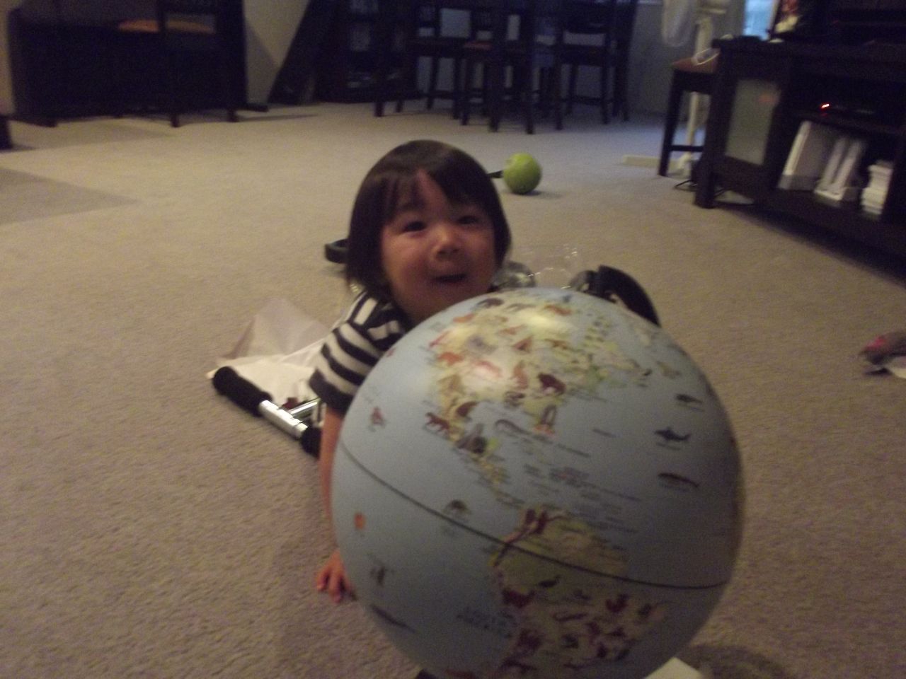 世界の動物が書いてある地球儀とボールがやってきました。