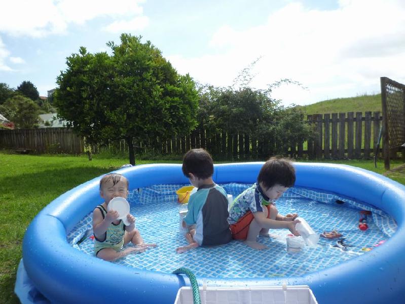 晴れ間をみつけたセオっちが、置いてあったプールに足をつっこんだのが