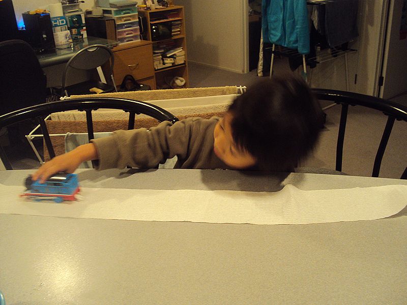 トイレットペーパーを広げて、線路だって。