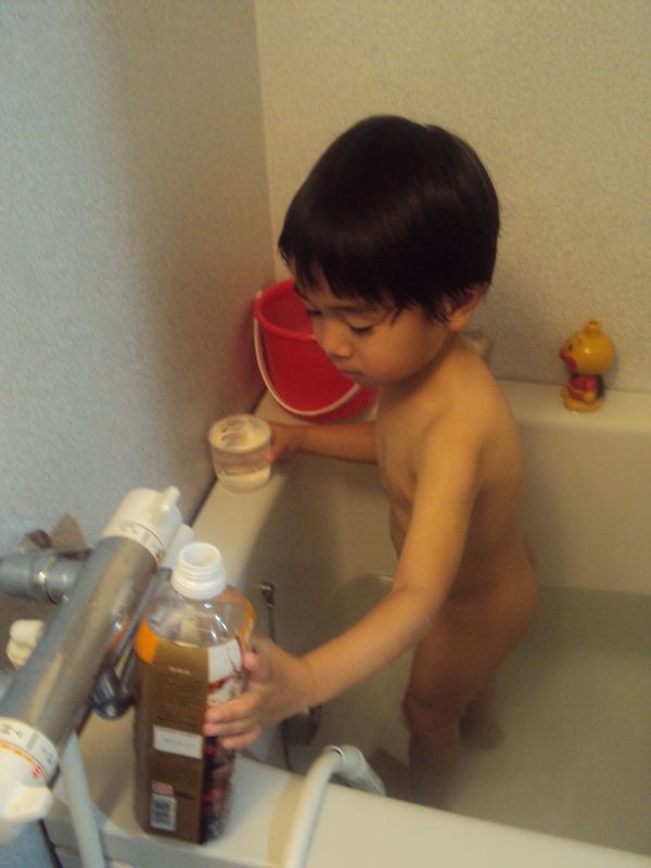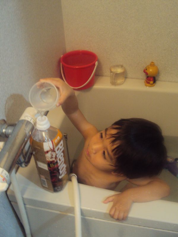 朝からお風呂の残り湯で水遊び