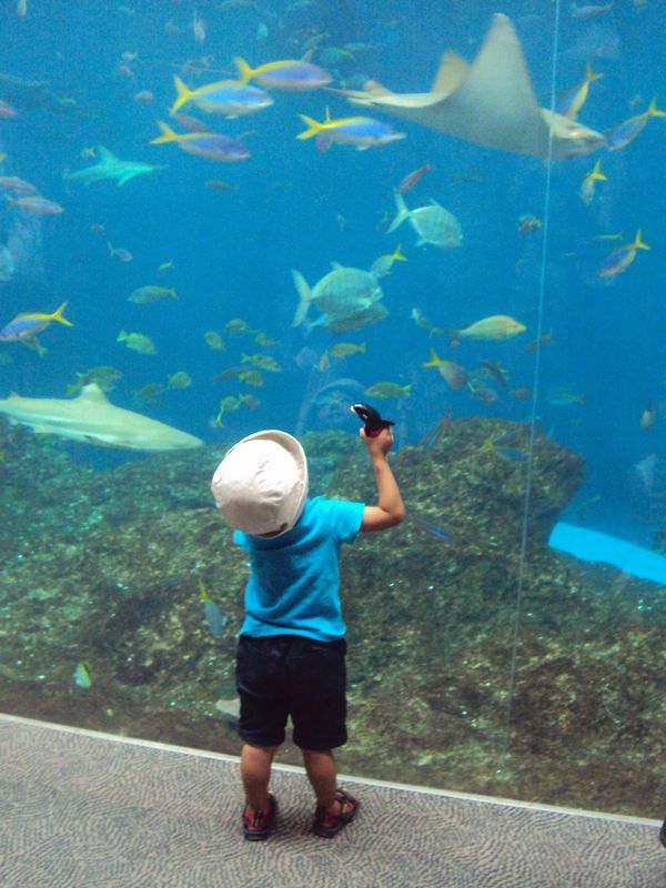 と水槽越しの魚にシャチが載っている入園チケットを見せて話をしていました(笑)