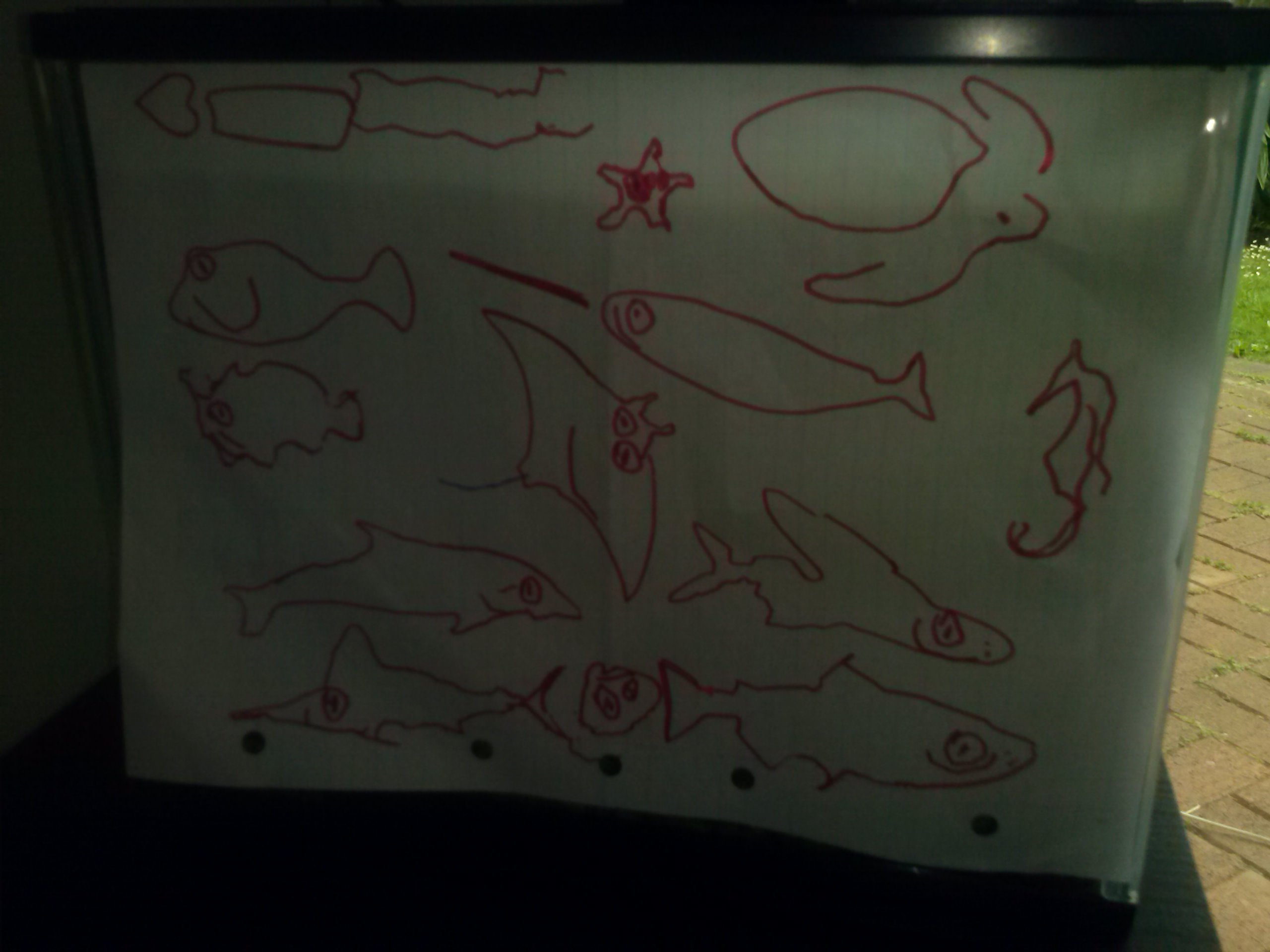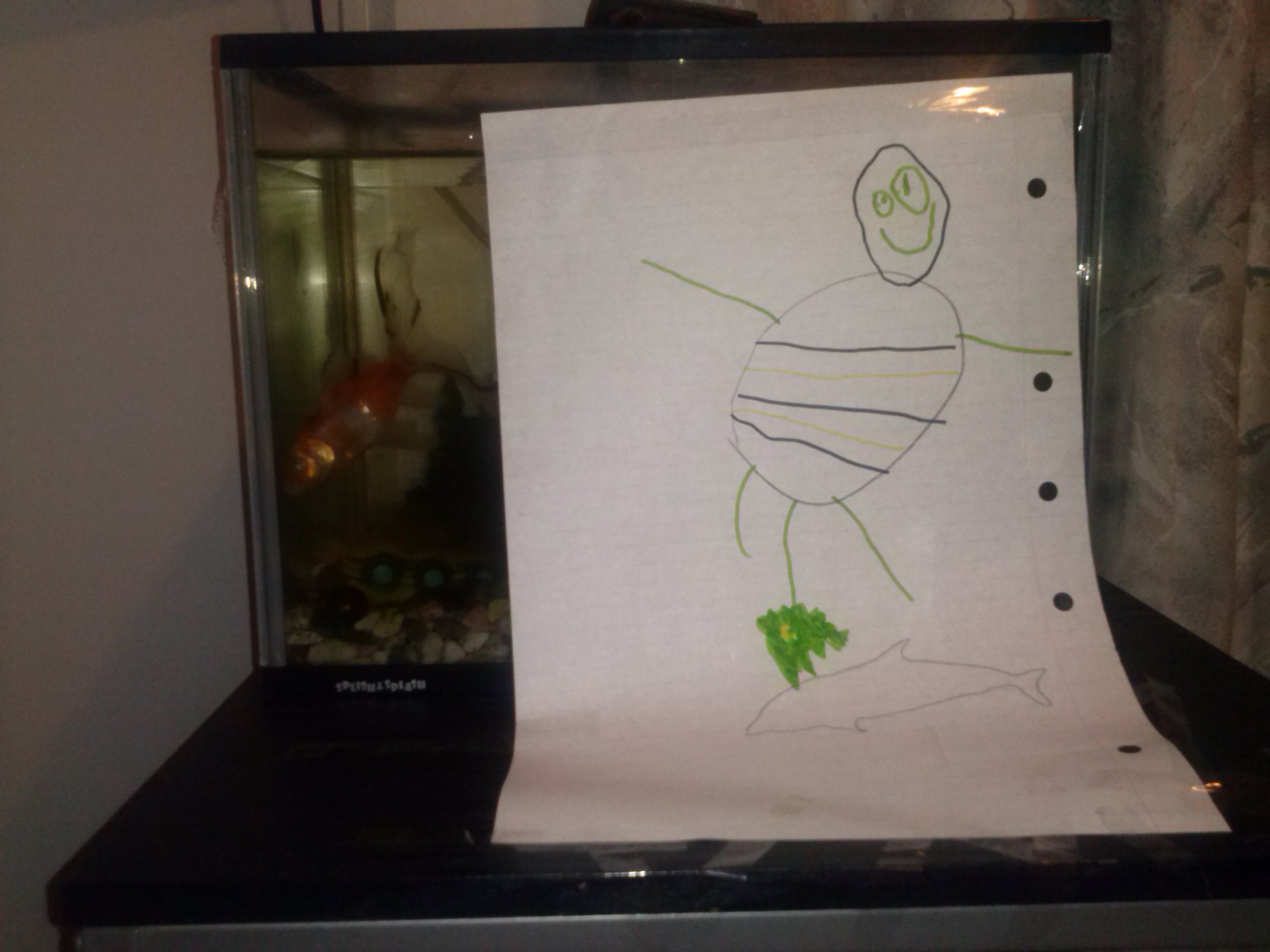 セオは水槽に絵をはっていました。