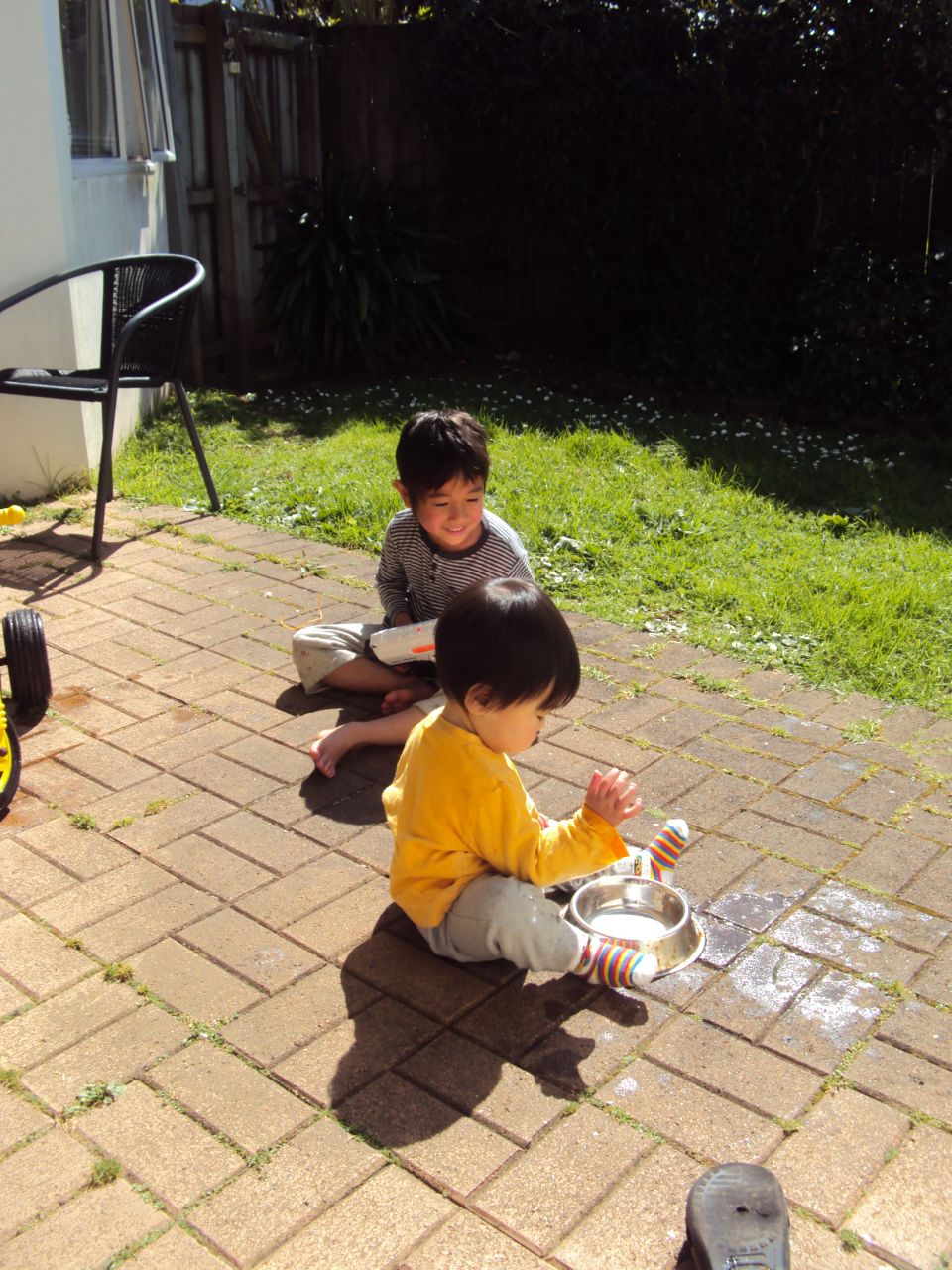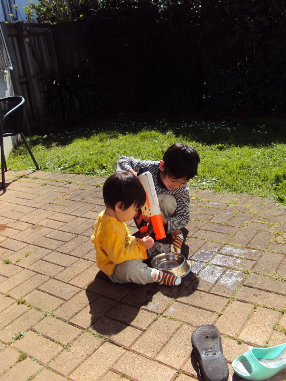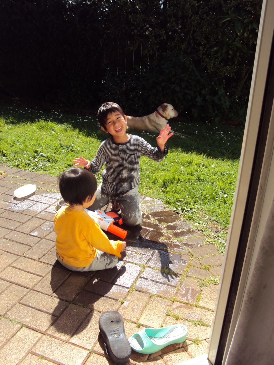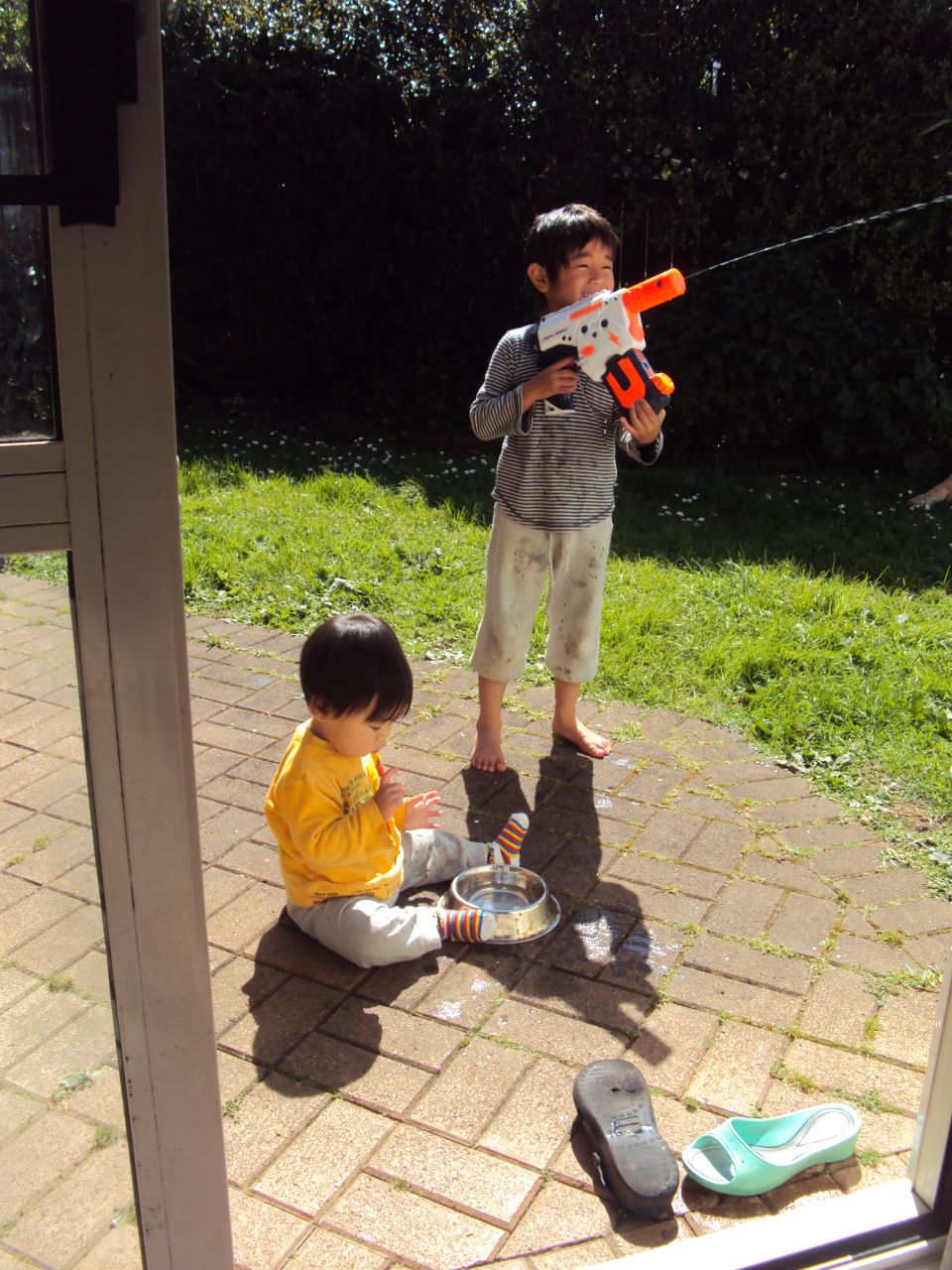 帰ってきた途端に水で遊び始めた兄弟。