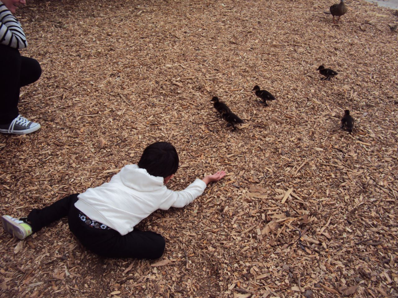 靴と靴下をぬいで外の固定遊具で遊び始め、