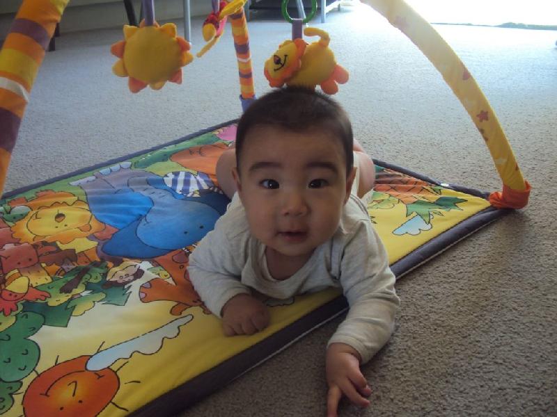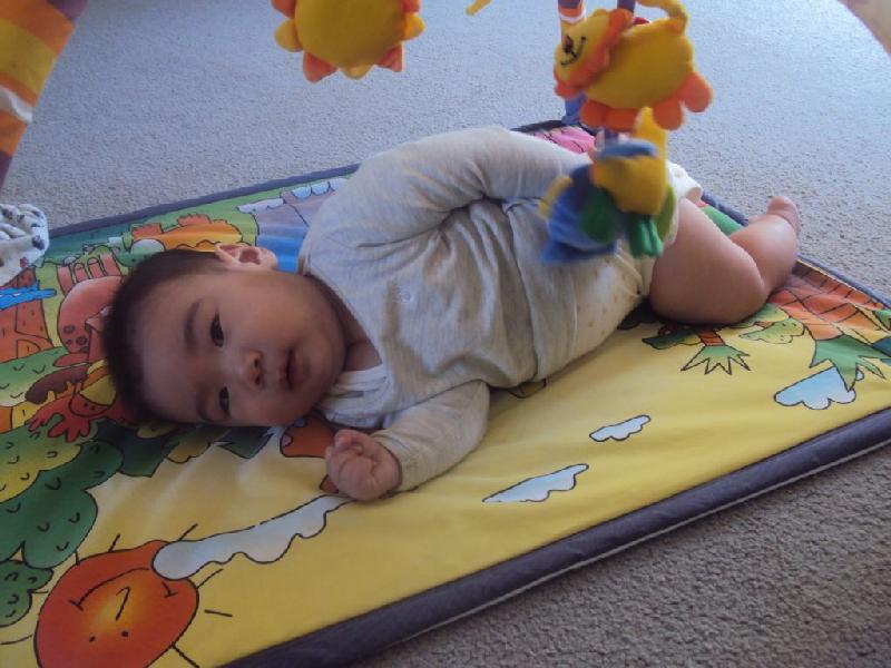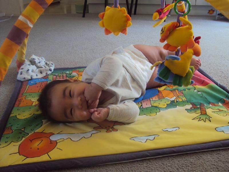 寝っころがらせておくと(仰向け)、手をいじったりつるされているおもちゃを