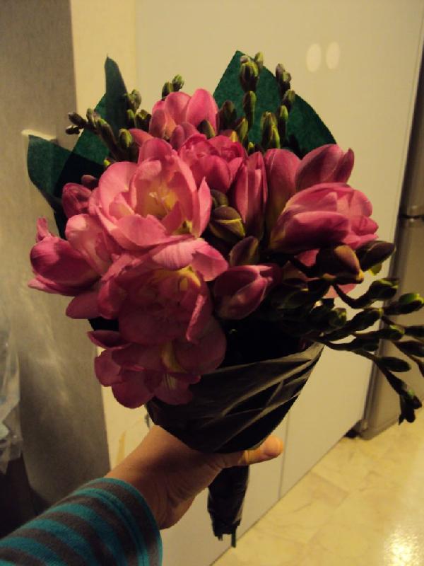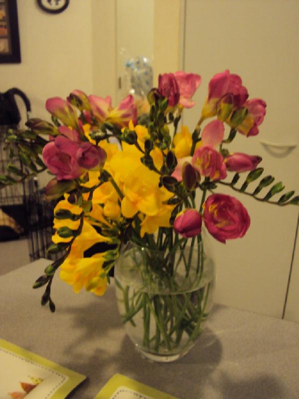 庭にある黄色のフリージアとまぜて飾ってみました。