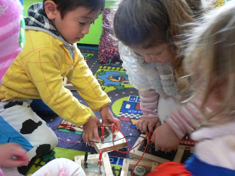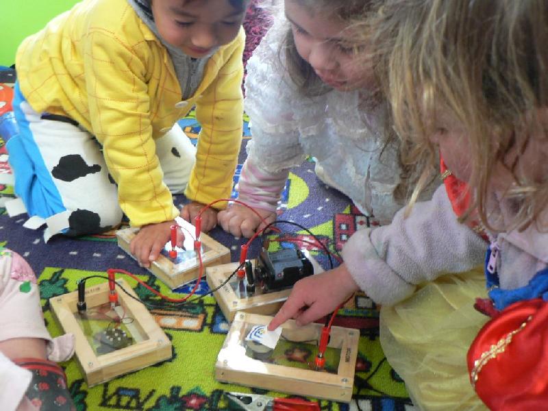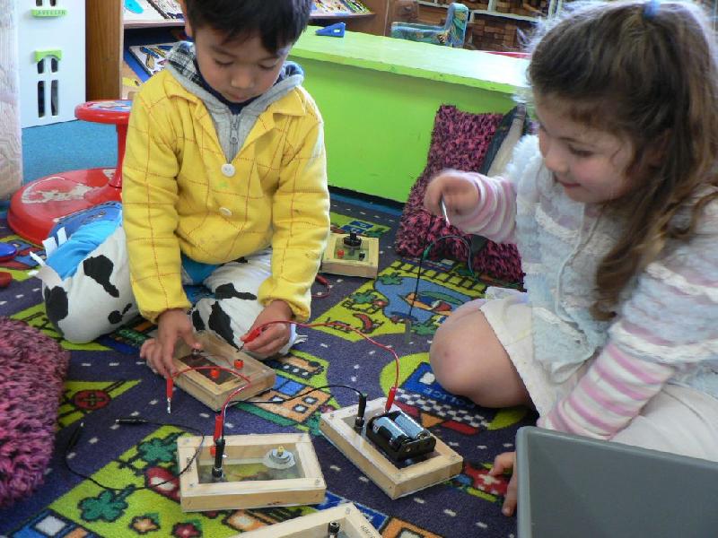 Electricity(電気学?)・コード、電池、スイッチをつなげて、ブザーとモーター、それから