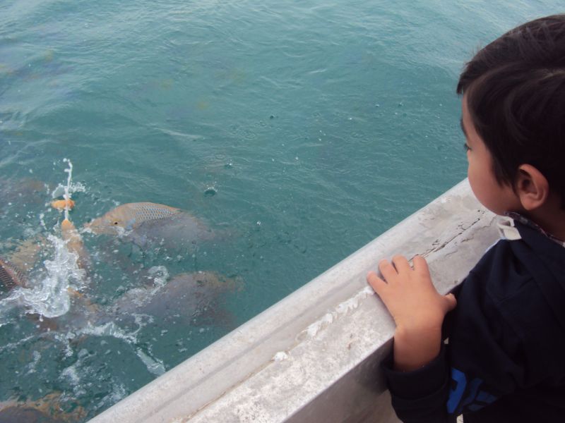 帰りの船ではえさやりをさせてもらったセオっち。